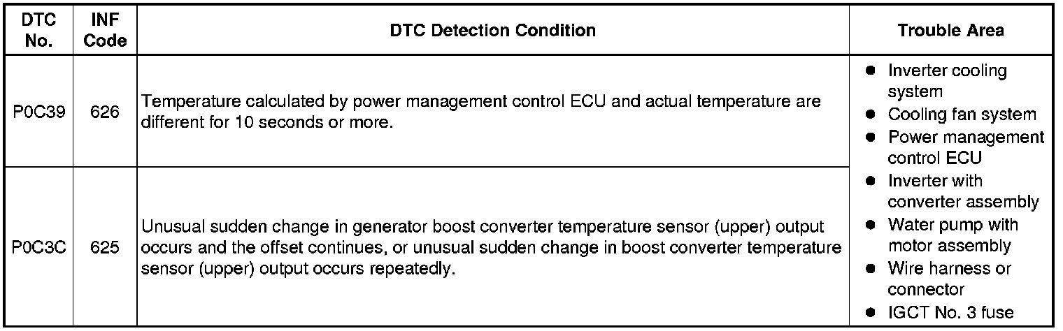 P0C39-626 or P0C3C-625 may be set due to a malfunction which also causes DTCs in the preceding table to be set. In this case, first troubleshoot the output DTCs in the preceding table. Then, perform a test to attempt to reproduce the problems, and check that no DTCs are output.