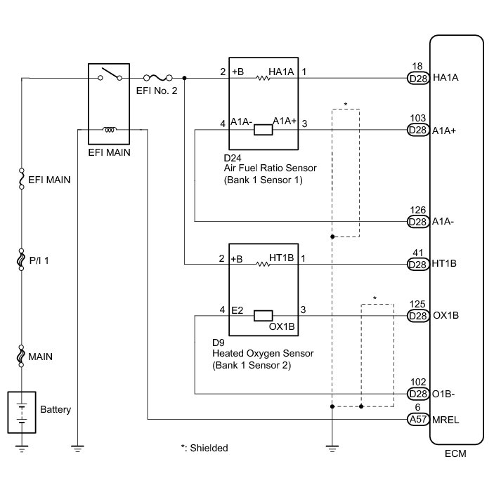 - The ECM regulates the voltages at the A1A+ and A1A- terminals of the ECM to a constant level. Therefore, the air fuel ratio sensor voltage output cannot be confirmed without using the Techstream.