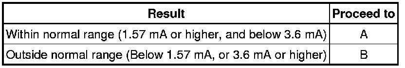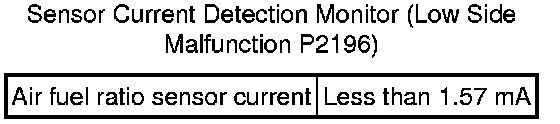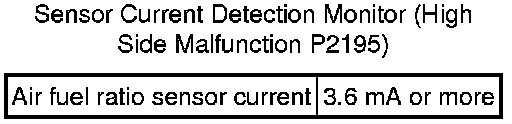 If the air fuel ratio sensor output is 3.6 mA or higher for more than 3 seconds of cumulative time, the ECM interprets this as a malfunction in the air fuel ratio sensor and stores DTC P2195 (stuck on high side). If the air fuel ratio sensor output is below 1.57 mA for more than 3 seconds of cumulative time, the ECM stores DTC P2196 (stuck on low side).