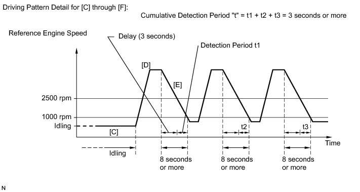 13. Soon after performing step [D] above, release the accelerator pedal for at least 8 seconds without depressing the brake pedal in order to execute fuel-cut control [E].