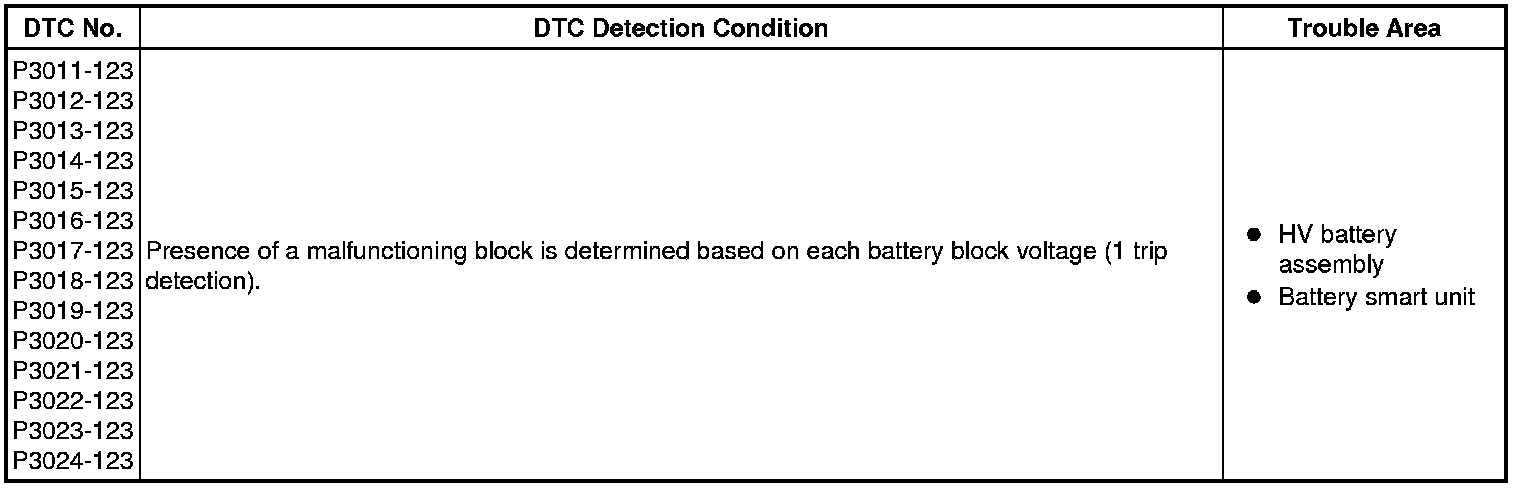 If there is an abnormal internal resistance or electromotive voltage in the battery blocks, the battery smart unit determines that a malfunction has occurred. When the malfunction detection condition is satisfied, the power management control ECU (HV CPU) will illuminate the MIL and set a DTC.