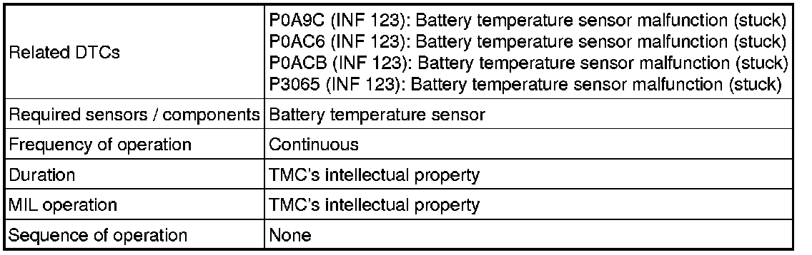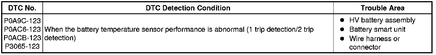 HYBRID / BATTERY CONTROL: HYBRID BATTERY SYSTEM: P0A9C-123,P0AC6-123,P0ACB-123,P3065-123: Hybrid Battery Temperature Sensor "A" Range / Performance