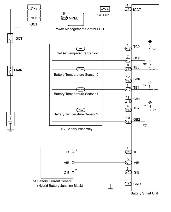 - The battery temperature sensors are provided at 3 locations of the HV battery. The resistance of the thermistor, which is built into each battery temperature sensor, varies in accordance with changes in the HV battery temperature. The lower the battery temperature, the higher the thermistor resistance. Conversely, the higher the temperature, the lower the resistance. The battery smart unit uses the battery temperature sensors to detect the HV battery temperature, and sends the detected value to the power management control ECU. Based on the results of this detection, the power management control ECU controls the blower fan. (The blower fan starts when HV battery temperature rises above a predetermined level.)