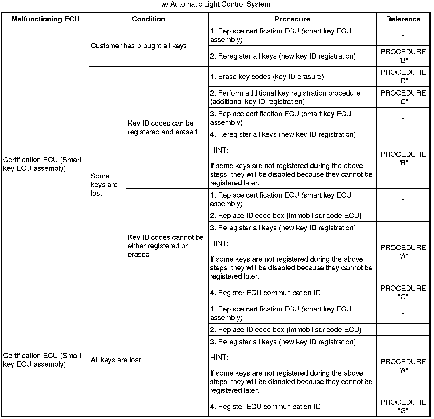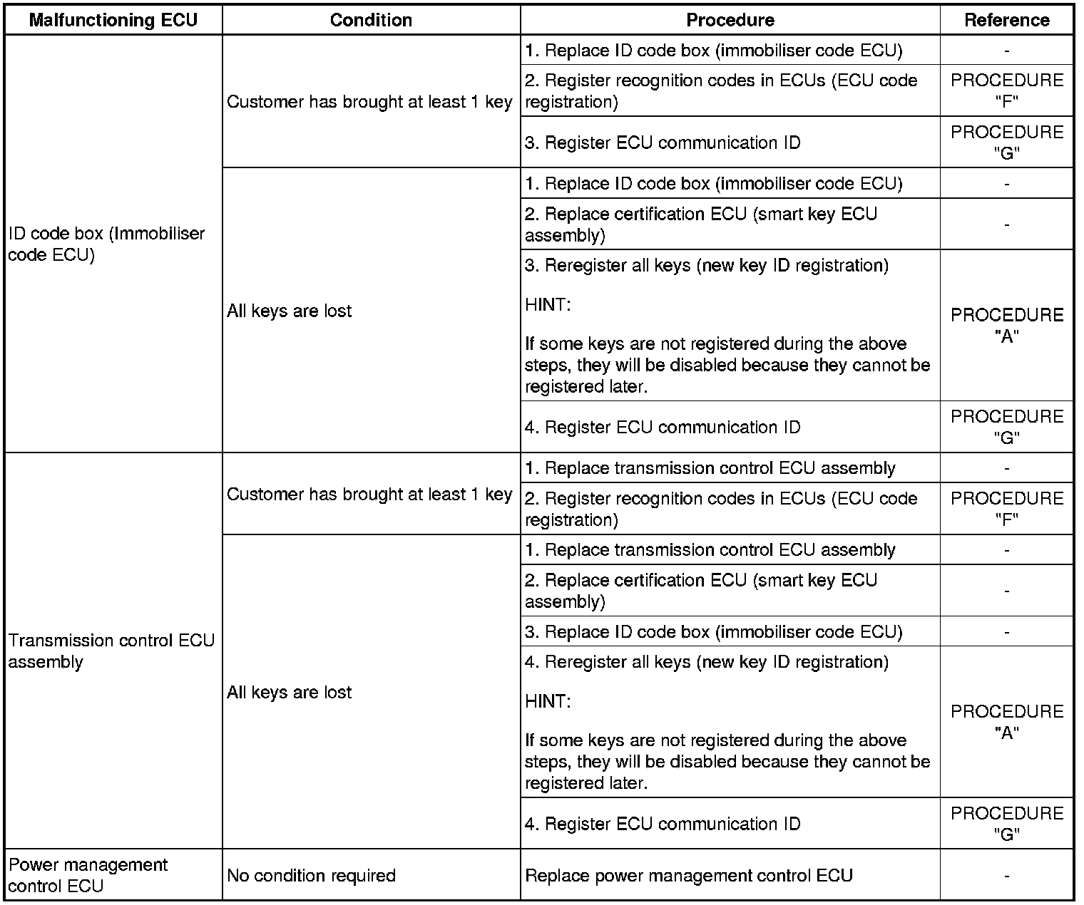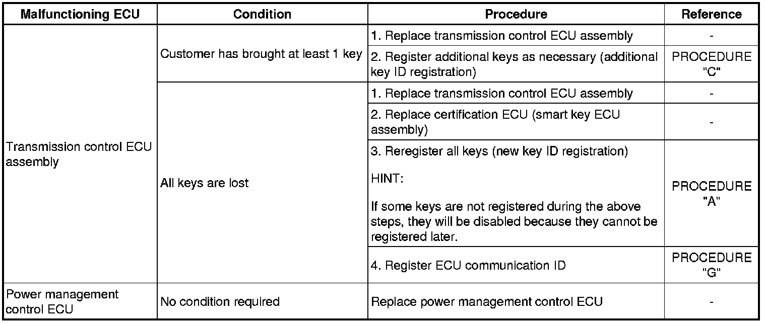 (a) The following table shows ECU replacement and key registration procedures for cases in which a malfunctioning ECU has been identified through the troubleshooting of the smart key system.