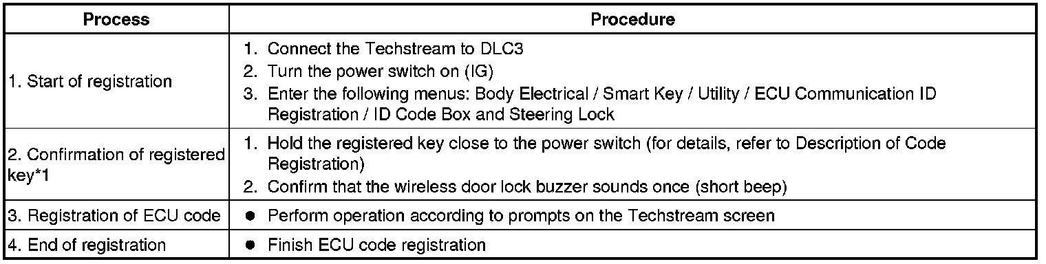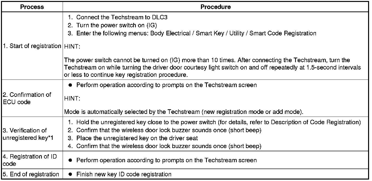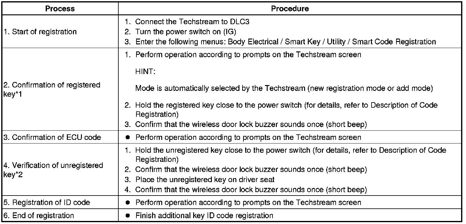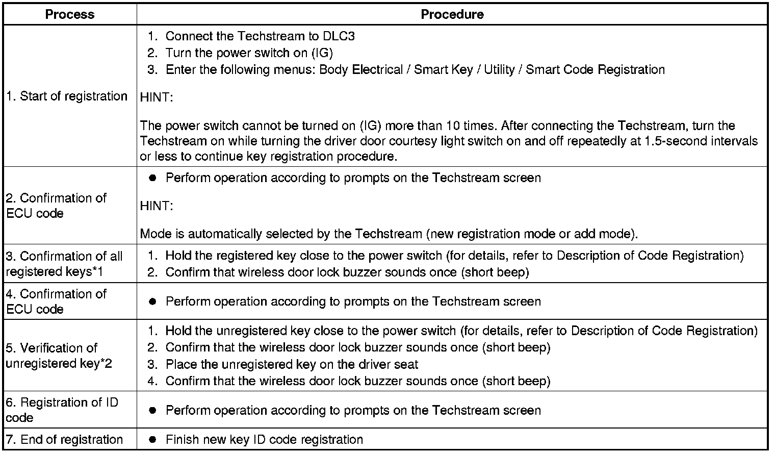 * *1: Perform this process for one of the keys which are to be registered for the vehicle. Finish the procedure within 30 seconds. If the procedure has not been finished within the specified time, perform the registration procedures again from process 1.