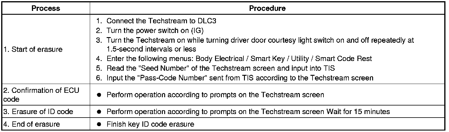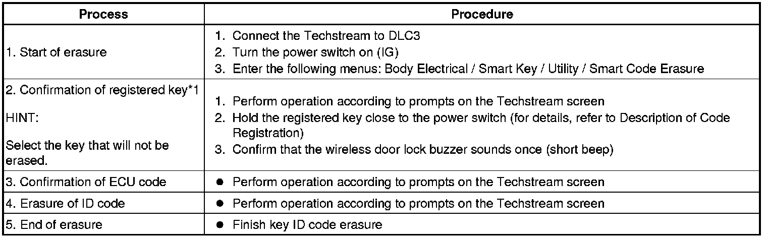 * *1: Perform this process for one of the keys which are to be registered for the vehicle. Finish the procedure within 30 seconds. If the procedure has not been finished within the specified time, perform the erasure procedure again from process 1.