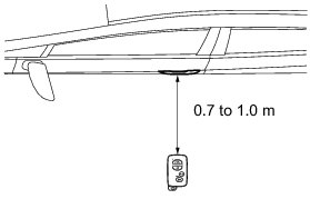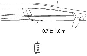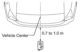Hold the electrical key transmitter at the same height as the rear bumper upper surface and align with the center of the rear of the vehicle (0.7 to 1.0 m (2.30 to 3.28 ft.)). Make sure that the direction of the key is as shown in the illustration.