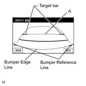 (1) Check that line A (indicating 1100 mm forward from the bumper edge) and the target bars are nearly overlapping and that the bumper reference lines and bumper edge line are nearly overlapping. With the steering wheel centered, check that the predicted path line is straight (overlapping the vehicle width extension lines).