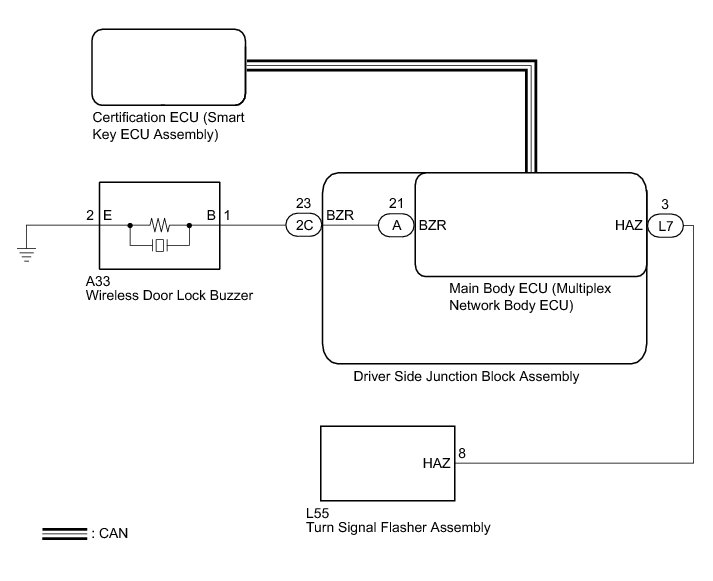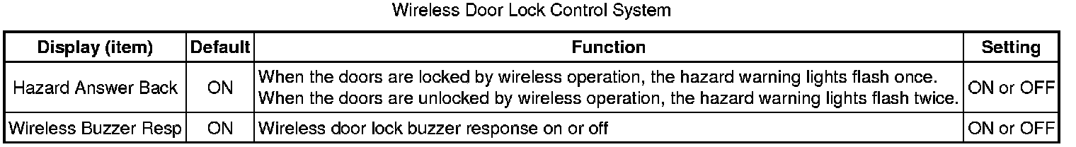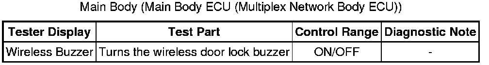 In some cases, wireless door lock control functions are normal but the hazard warning light and/or wireless door lock buzzer answer-back function(s) does not operate. In such cases, the hazard warning light and wireless door lock buzzer signals output from the main body ECU (multiplex network body ECU) may be malfunctioning.
