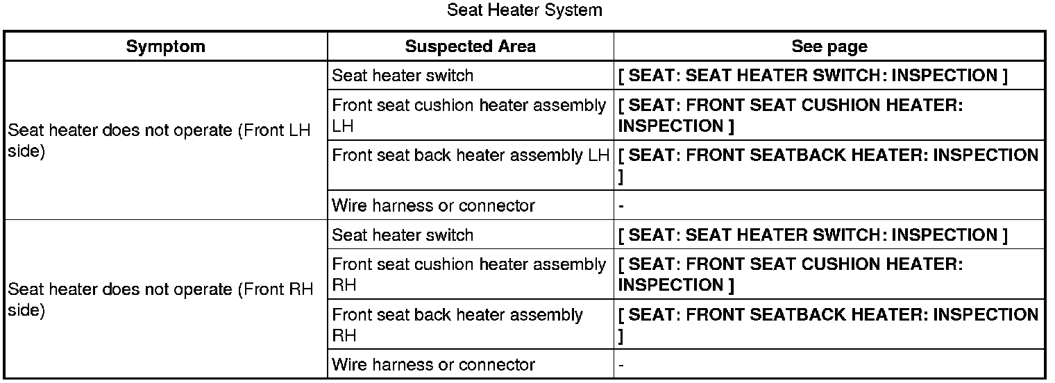 SEAT: SEAT HEATER SYSTEM: PROBLEM SYMPTOMS TABLE