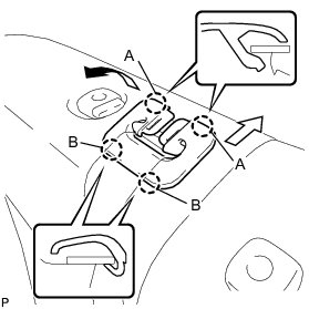 (g) Move the rear seat shoulder belt hole cover in the direction indicated by the arrow in the illustration to disengage the 2 claws (B) and remove the cover.