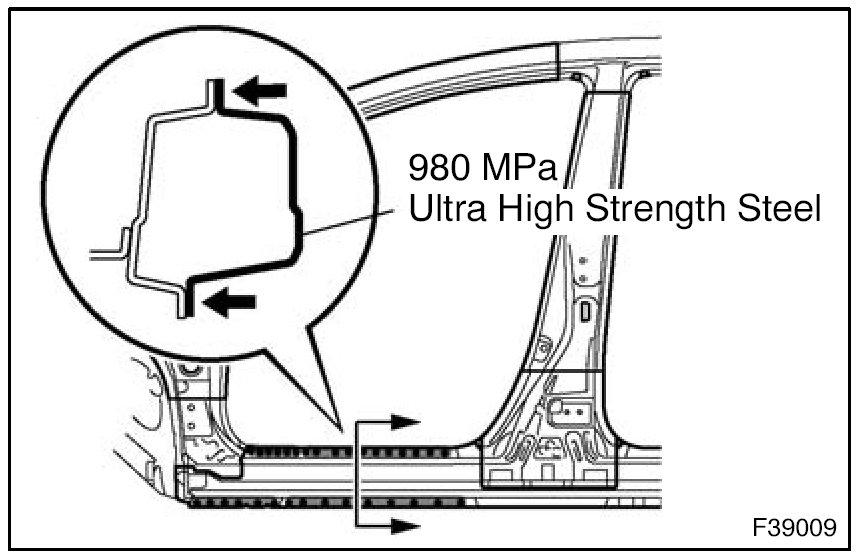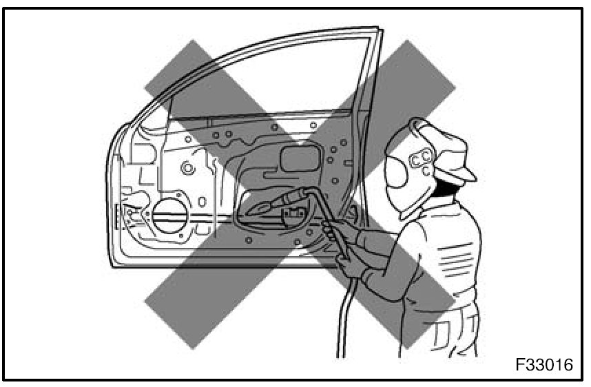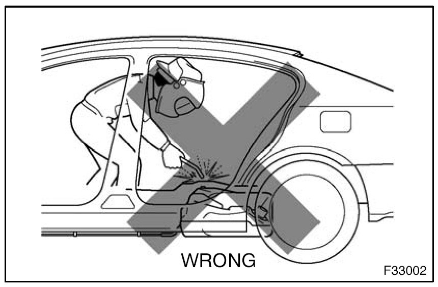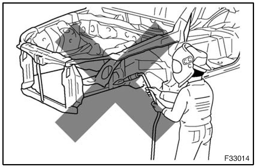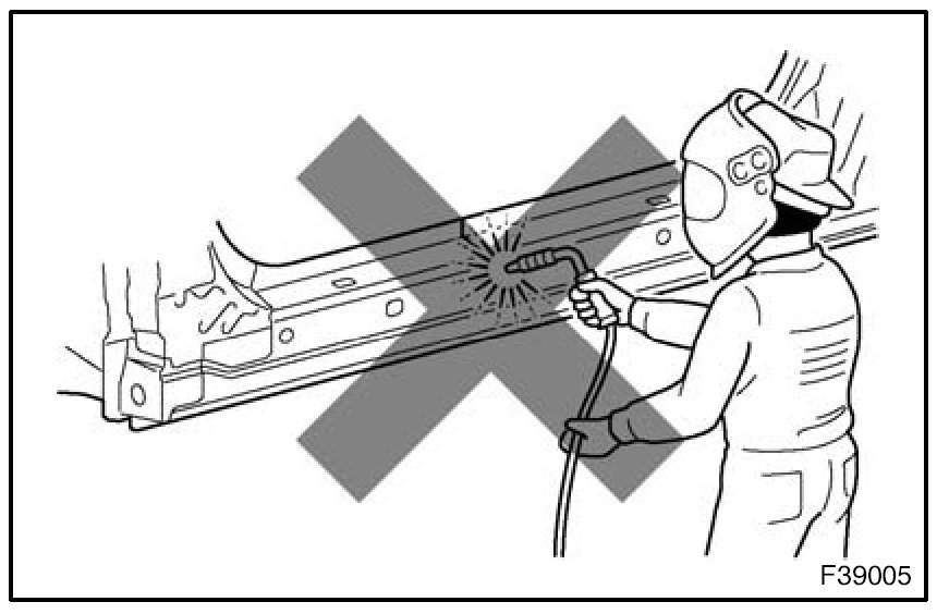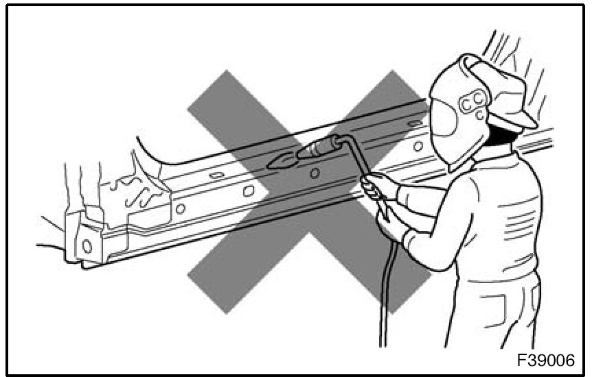 1. Rustproof high strength steel sheets are used for the body frame. Therefore, if these parts are heat repaired using an acetylene torch or equivalent, the crystalline structure changes, causing the strength of the steel sheets to decrease. Also, the zinc coating which is used to protect the body from rust will be damaged. This causes the surface of the steel sheets to become oxidized, which reduces their ability to resist rust.