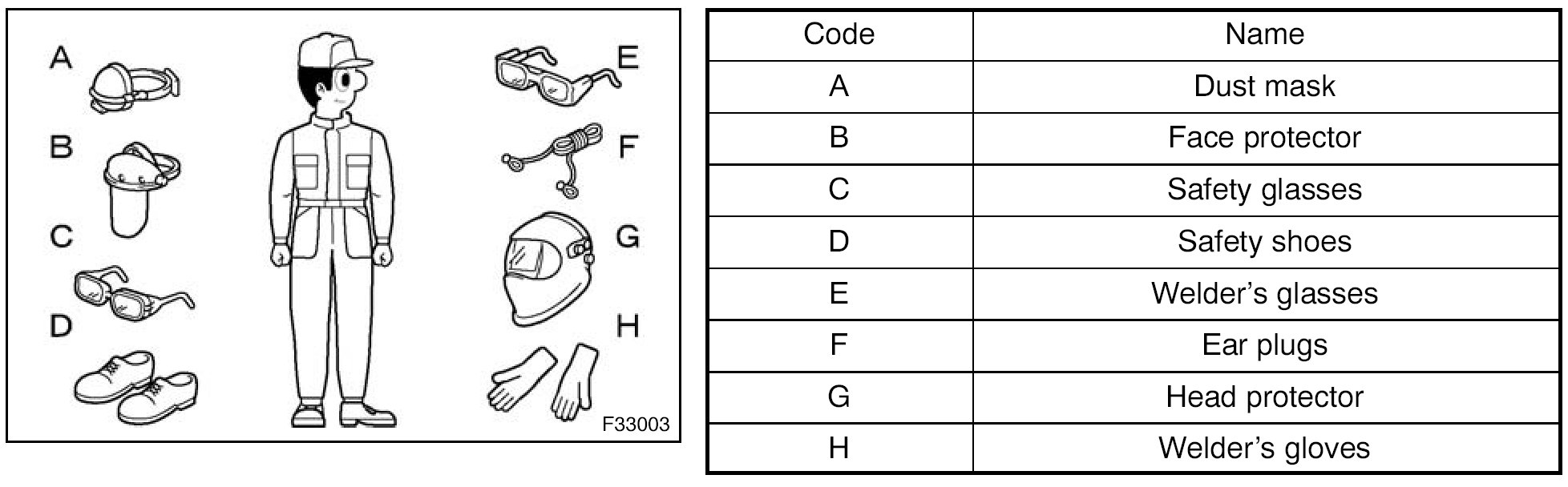 1. In addition to the usual mechanic's wear, cap and safety shoes, the appropriate gloves, head protector, welder's glasses, ear plugs, face protector, dust mask, etc. should be worn as the situation demands.