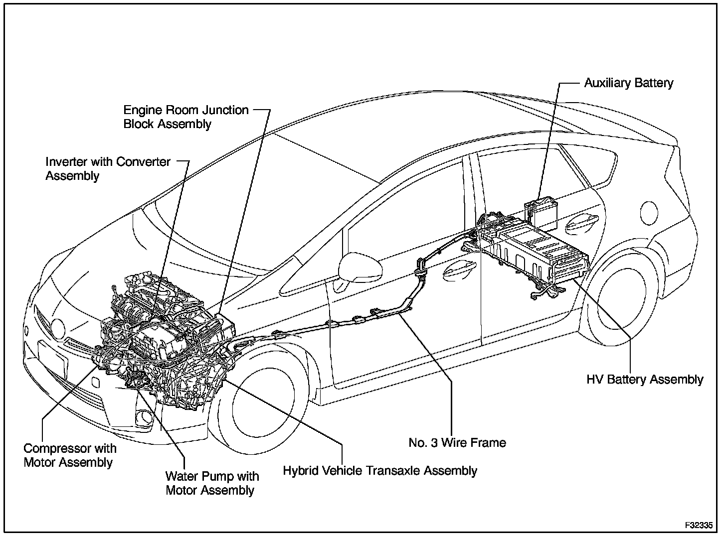 2. All high-voltage wire harnesses and connectors are colored orange. The HV battery and other high-voltage components have "High Voltage" caution labels. Do not carelessly touch these wires or components.