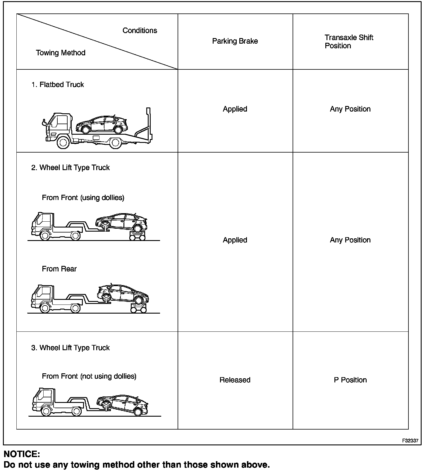 2. Do not use a sling-type towing method either from the front or rear.