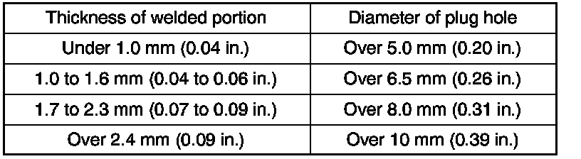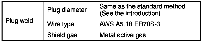 NOTICE: Be sure to use Metal active gas (Ar 80% + CO2 20%) as the shield gas when plug welding. Sufficient weld strength cannot be assured when using 100% CO2 shield gas.