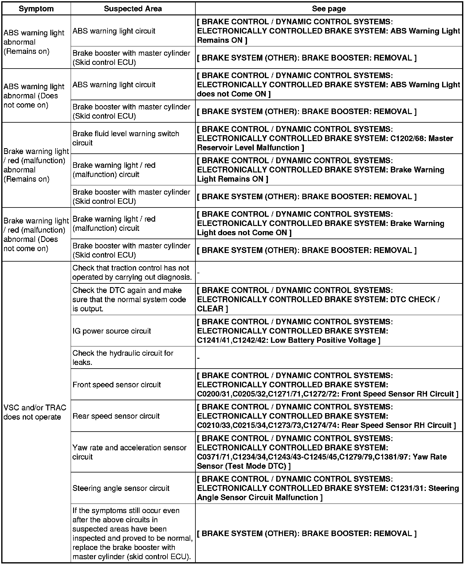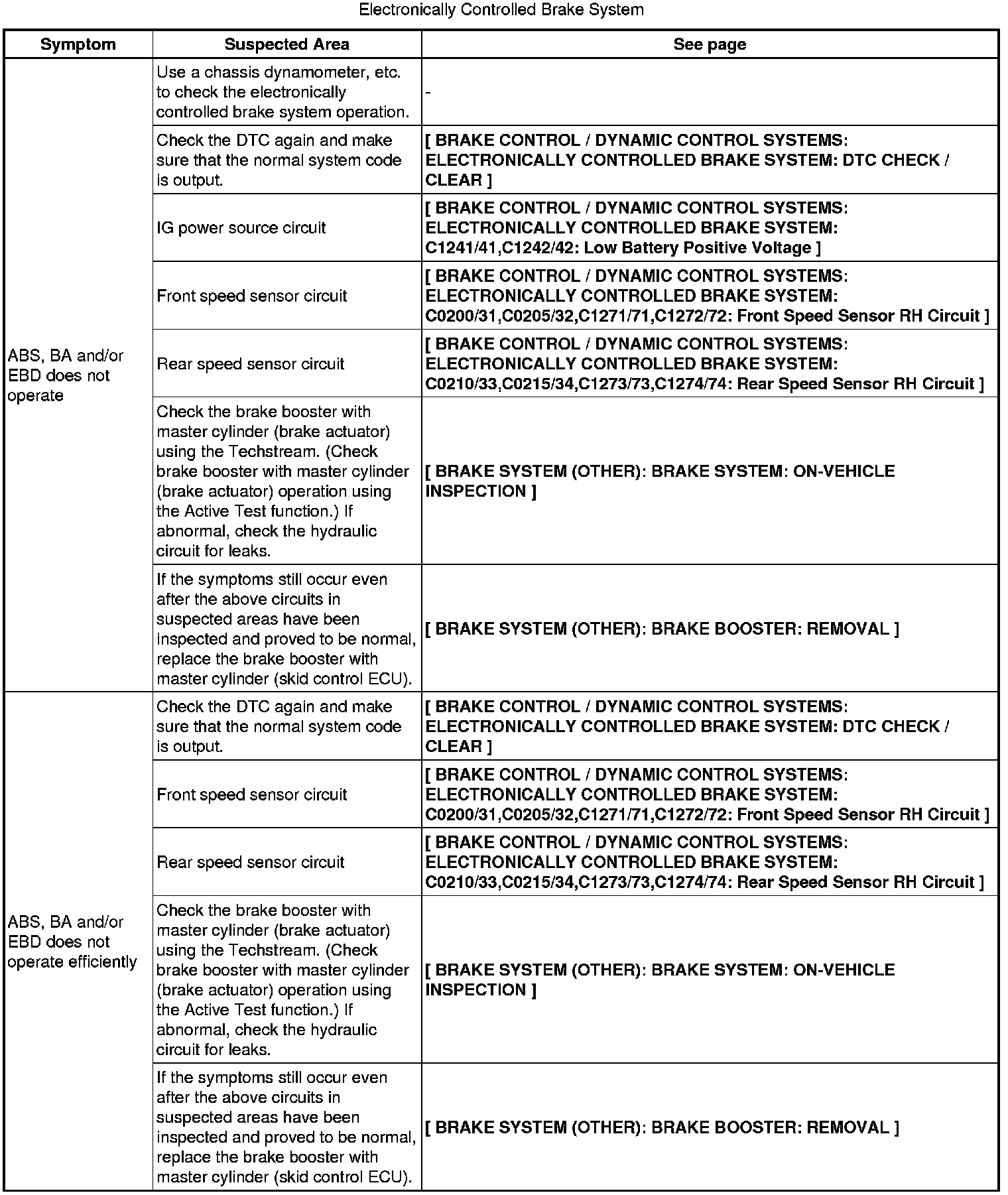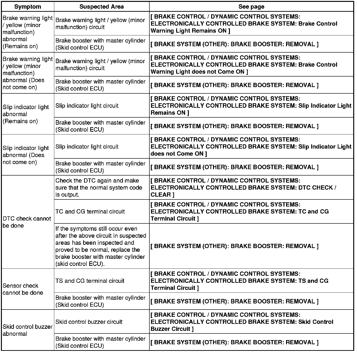 BRAKE CONTROL / DYNAMIC CONTROL SYSTEMS: ELECTRONICALLY CONTROLLED BRAKE SYSTEM: PROBLEM SYMPTOMS TABLE