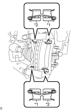 (a) Install the 2 front No. 1 disc brake pad support plates and 2 front No. 2 disc brake pad support plates to the front disc brake cylinder mounting.
