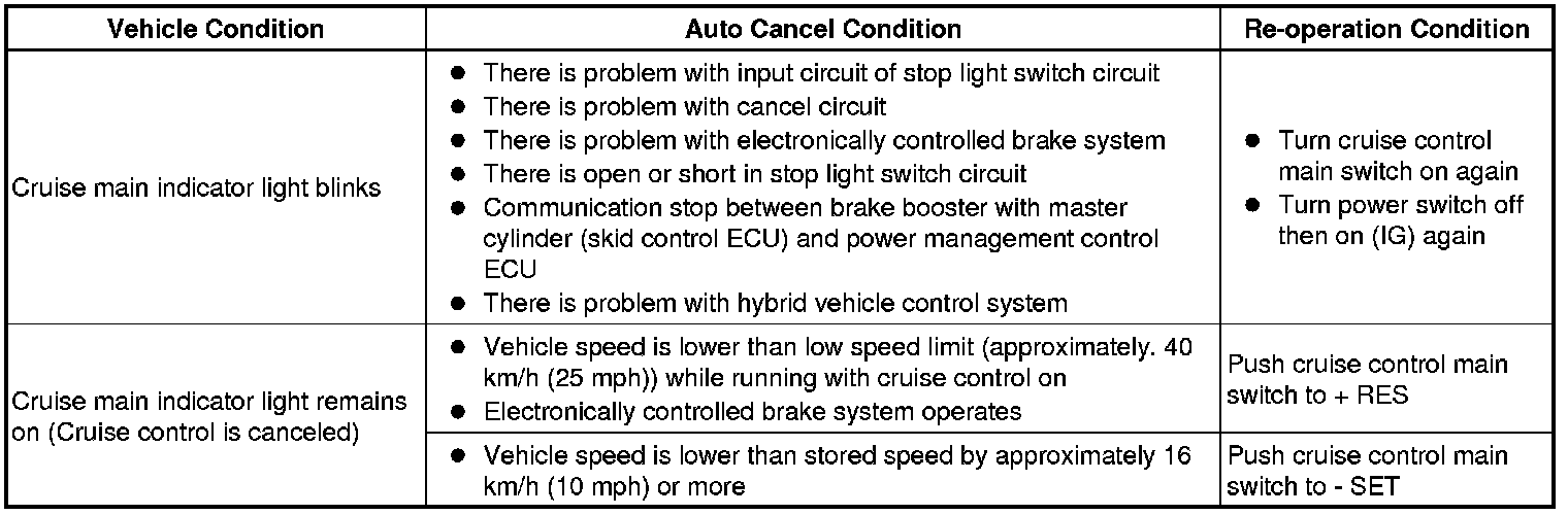 If the following conditions are detected while cruise control is in operation, the system clears the stored vehicle speed in the hybrid vehicle control ECU and cancels the cruise control operation.