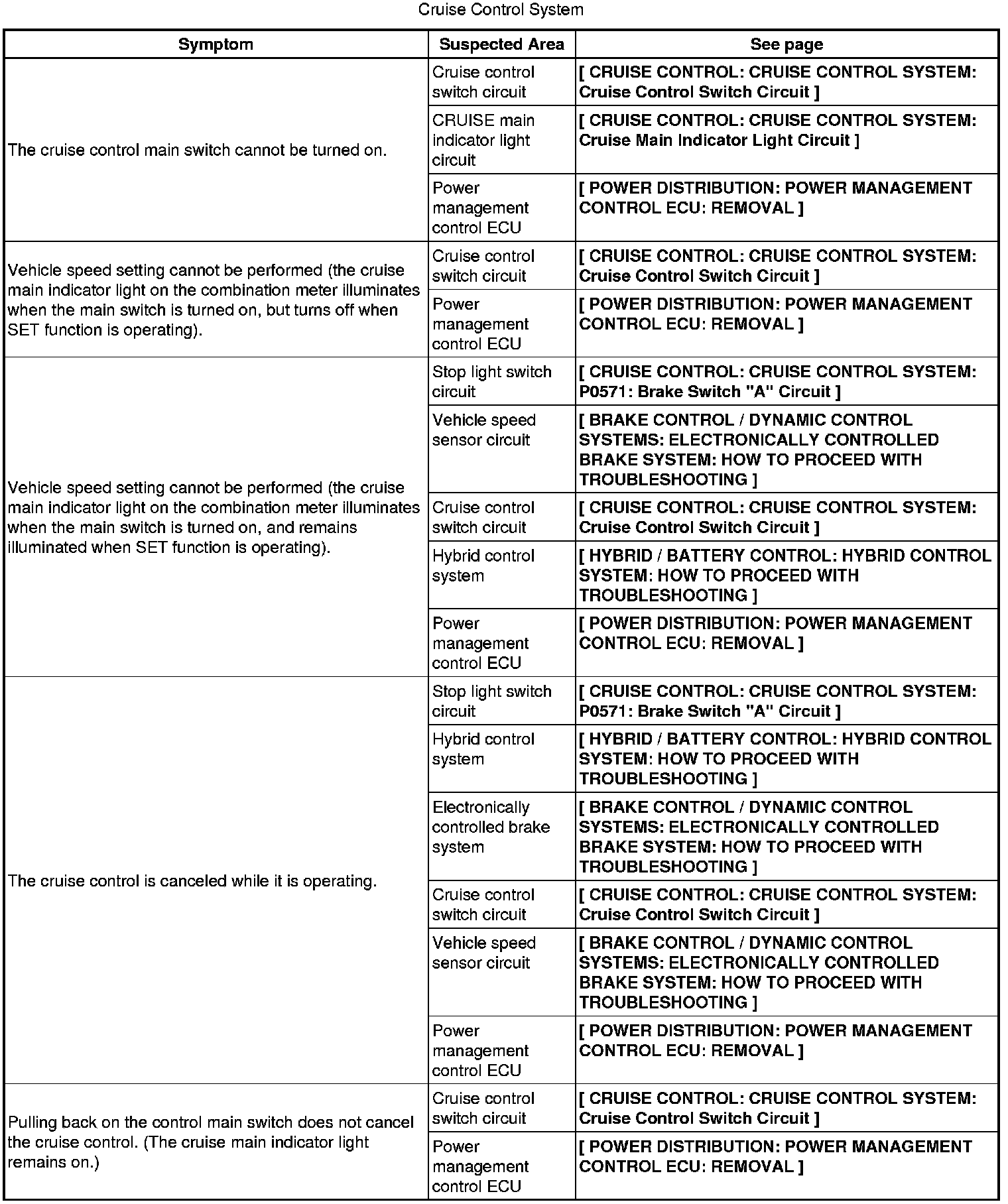 CRUISE CONTROL: CRUISE CONTROL SYSTEM: PROBLEM SYMPTOMS TABLE