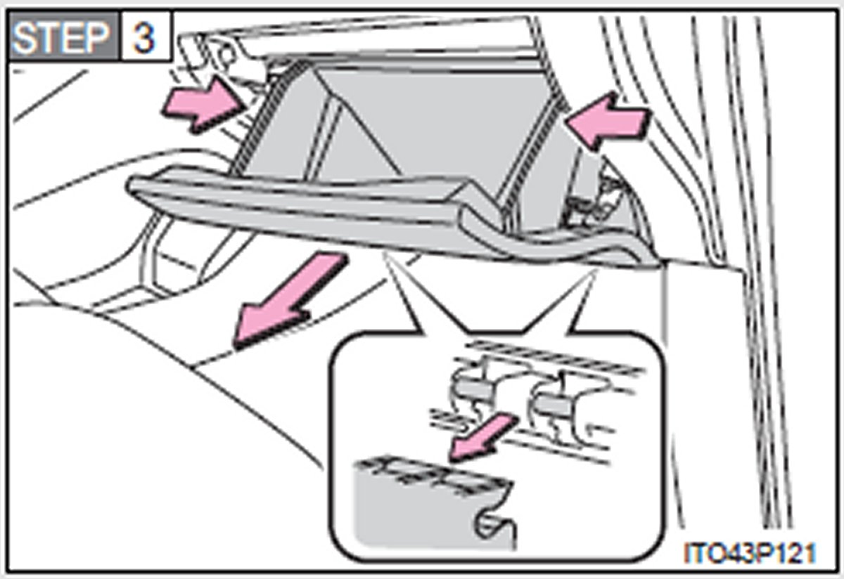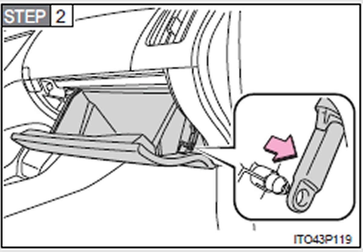 3. Push each side of the glove box to release the pins. Then disconnect the claws at the bottom and remove the glove box.