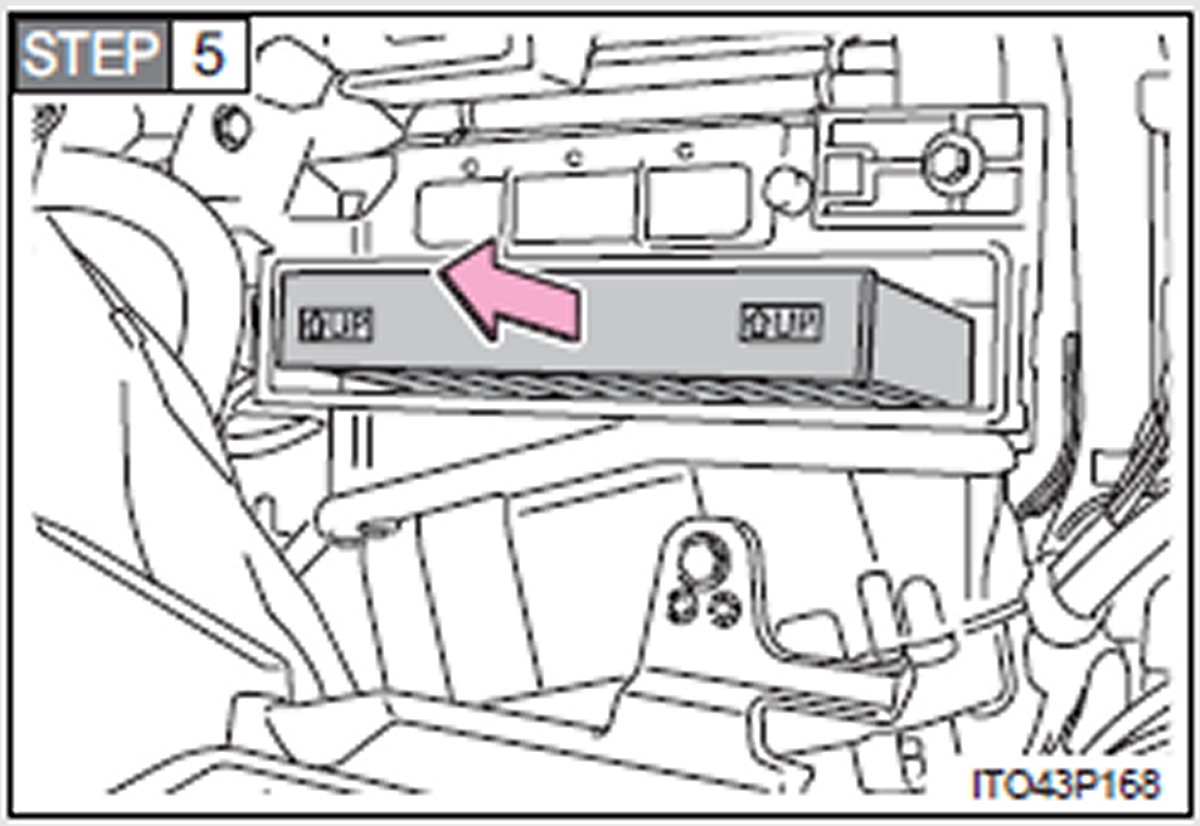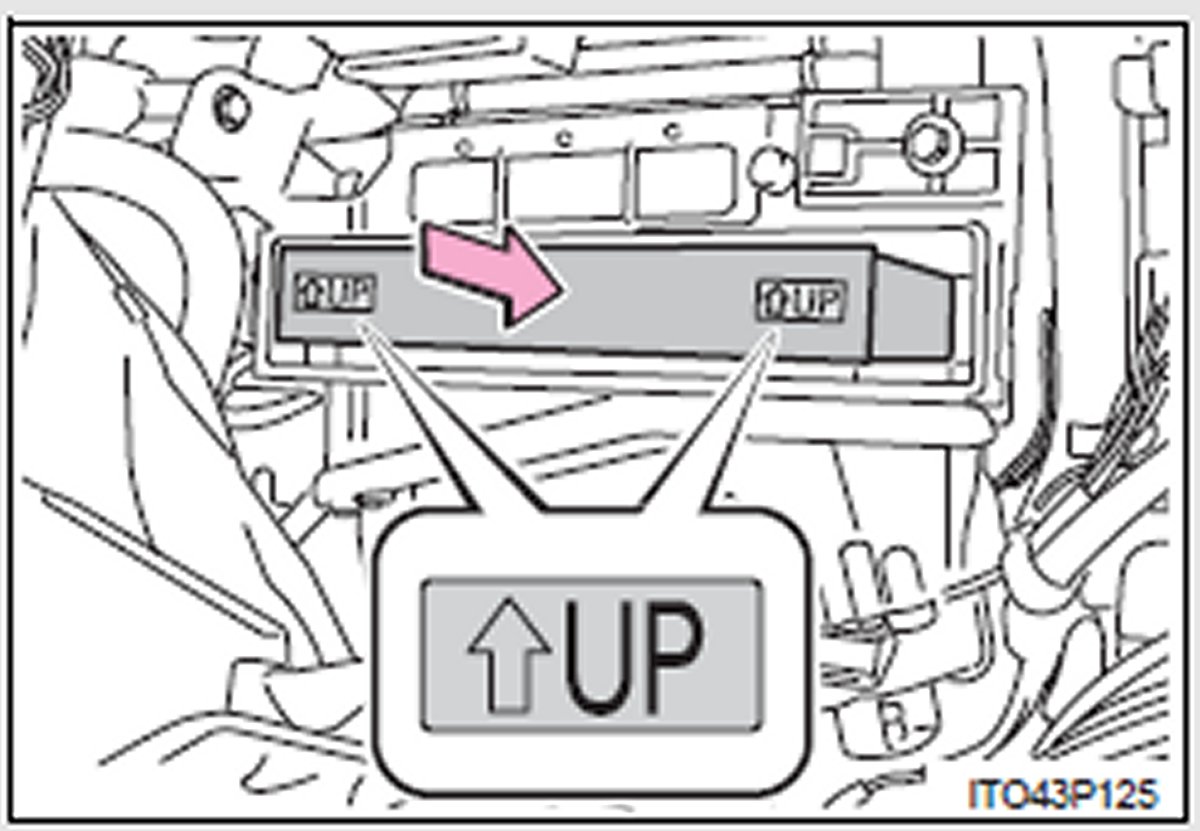 Remove the air conditioning filter and replace it with a new one. The UP mark on the filter should be pointing up.