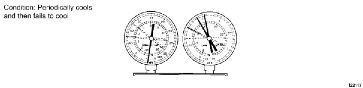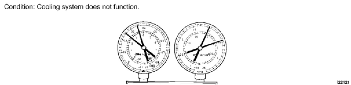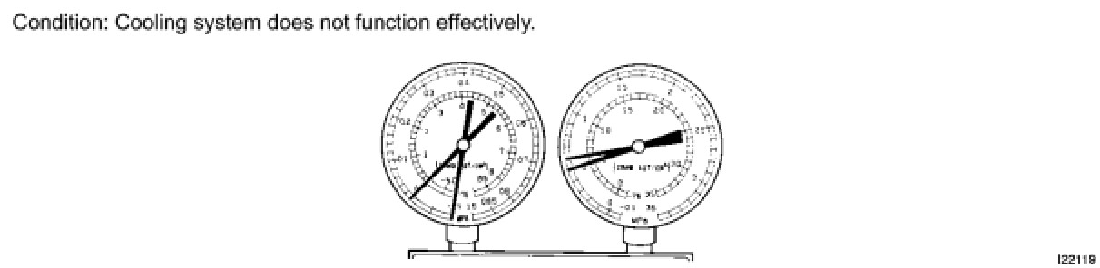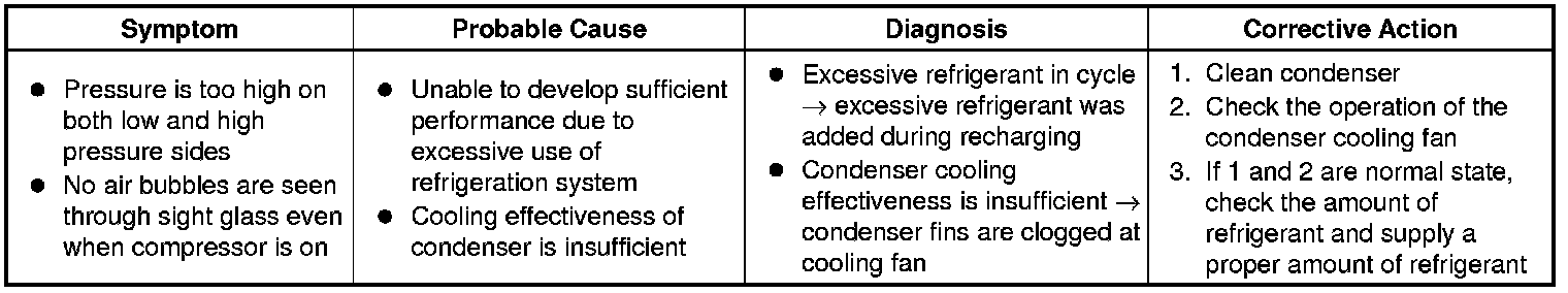 (6) Refrigerant is overcharged or cooling effectiveness of condenser is insufficient.