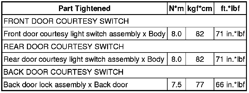 SPECIFICATIONS: LIGHTING (INT): TORQUE SPECIFICATIONS