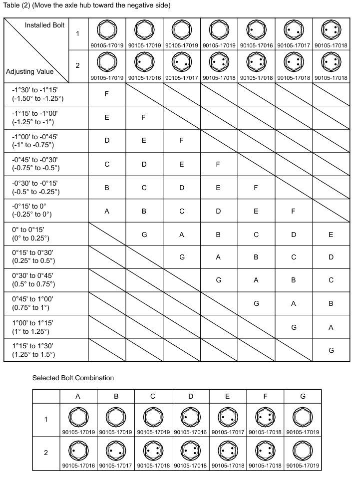 Check the combination of the installed bolts. Select appropriate bolts from the tables below to adjust the camber to the specified values.