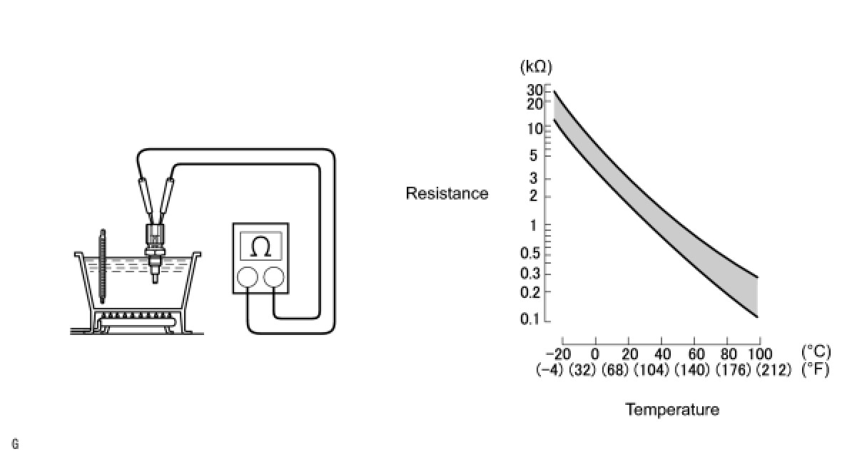 When checking the engine coolant temperature sensor in water, keep the terminals dry. After the check, dry the engine coolant temperature sensor.