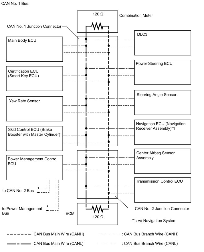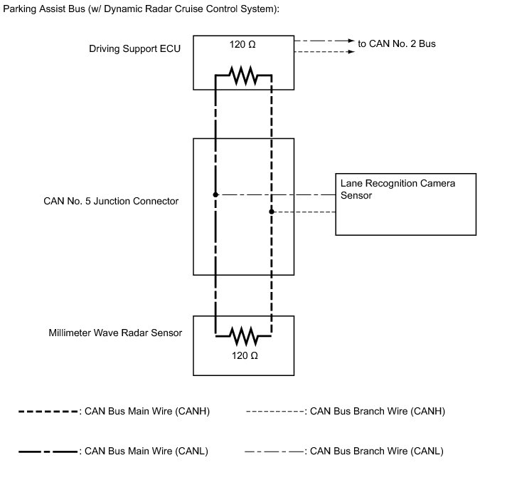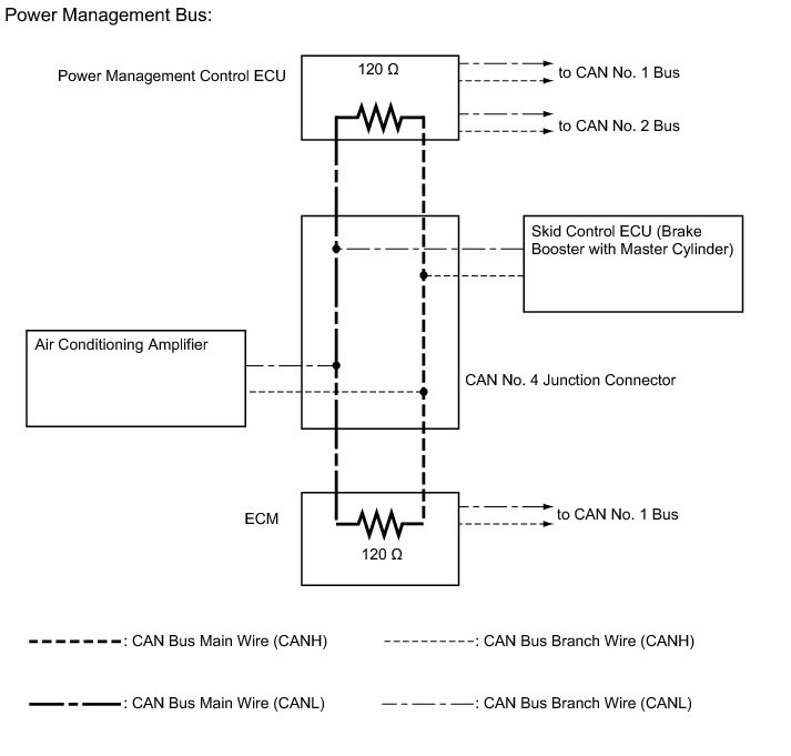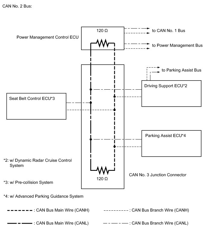 (a) The CAN No. 1 bus, CAN No. 2 bus, power management bus and parking assist bus each have termination circuits with two resistors of 120 Ohms. High speed communication at 500 kbps is possible.