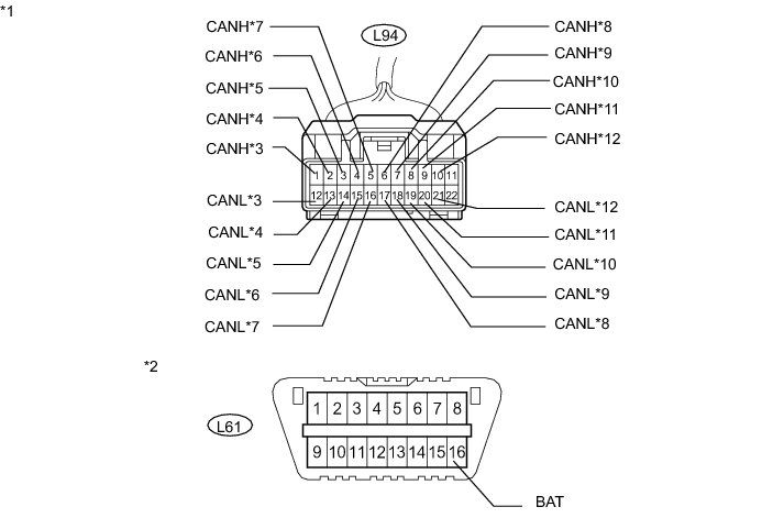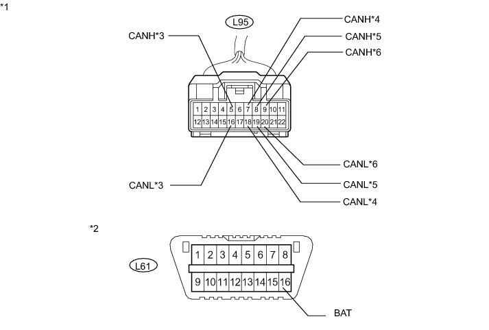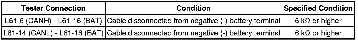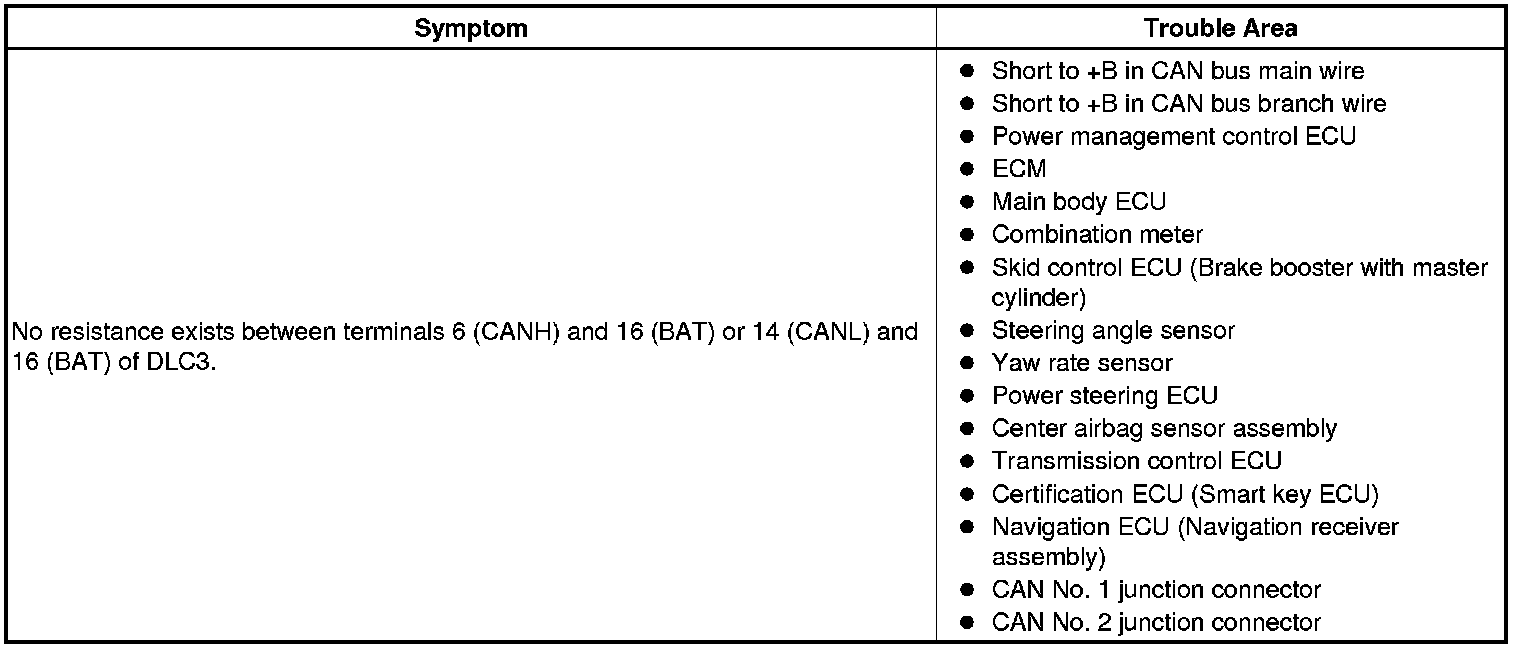 There may be a short circuit between the CAN bus main wire and +B when no resistance exists between terminals 6 (CANH) and 16 (BAT) or 14 (CANL) and 16 (BAT) of the DLC3.