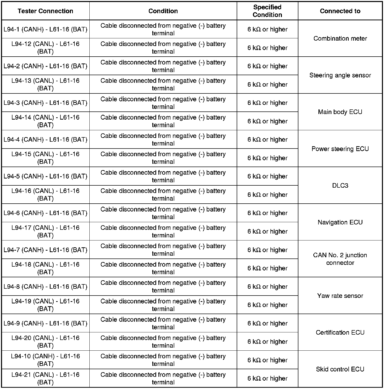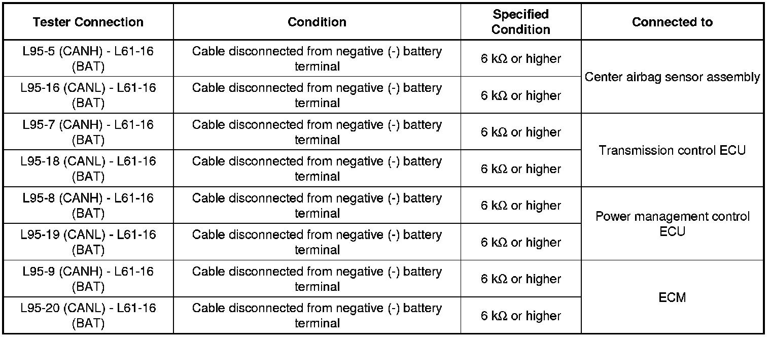If the ECU or sensor has multiple connectors, disconnect the connector that includes the CAN bus wires. To determine the ECU or sensor that is connected to the shorted bus wire, refer to the terminals of ECU tables CAN Communication System.