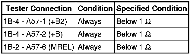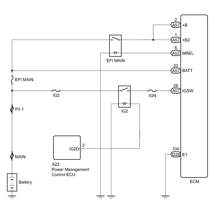 When the power switch is turned on (IG), battery voltage is applied to IGSW of the ECM. The output signal from the MREL terminal of the ECM causes a current to flow to the coil, closing the contacts of the integration relay (EFI MAIN relay) and supplying power to either terminal +B and +B2 of the ECM.