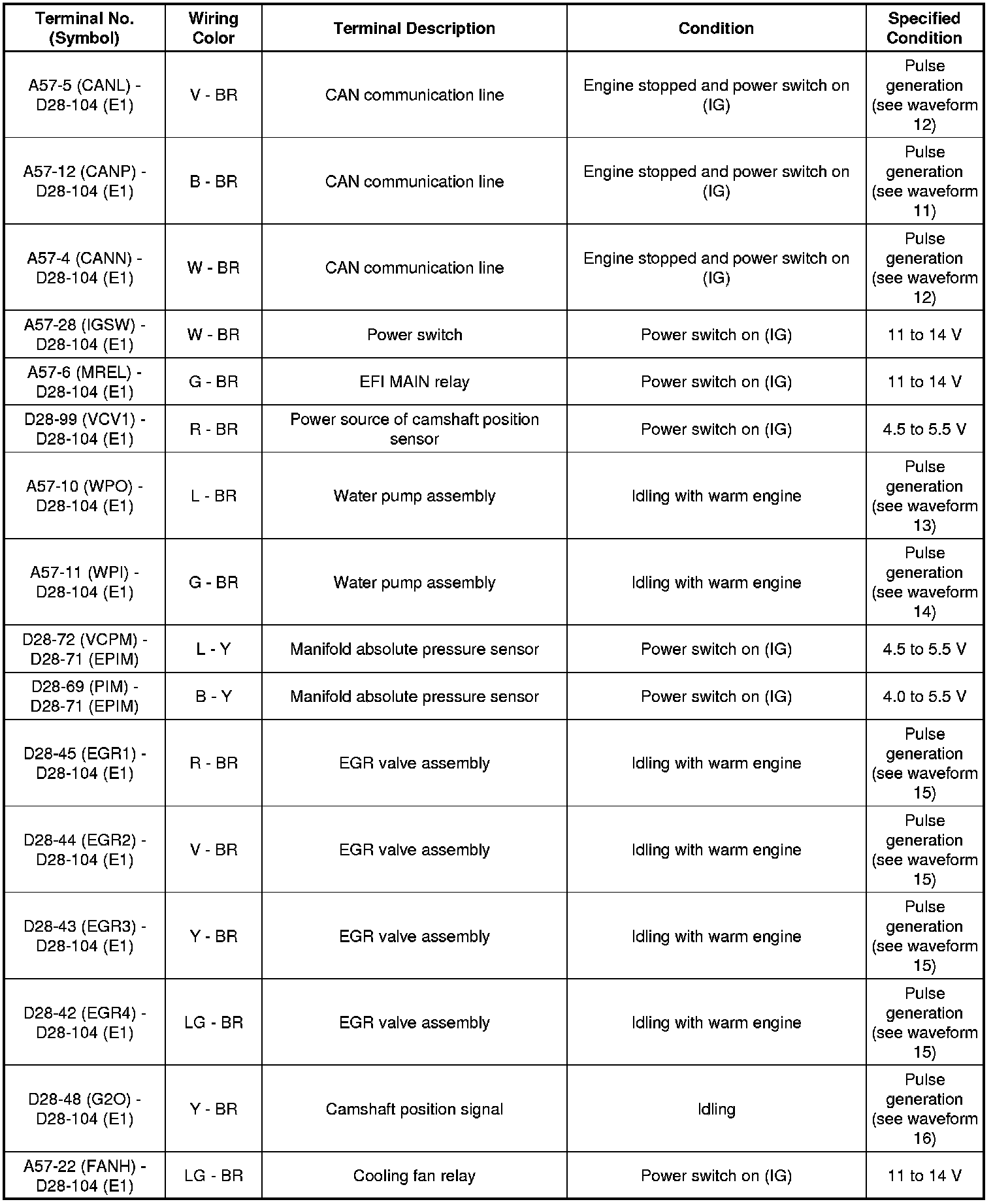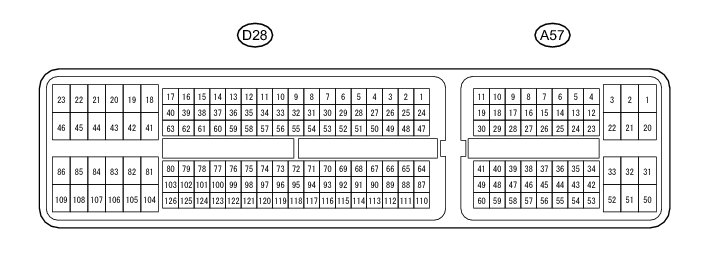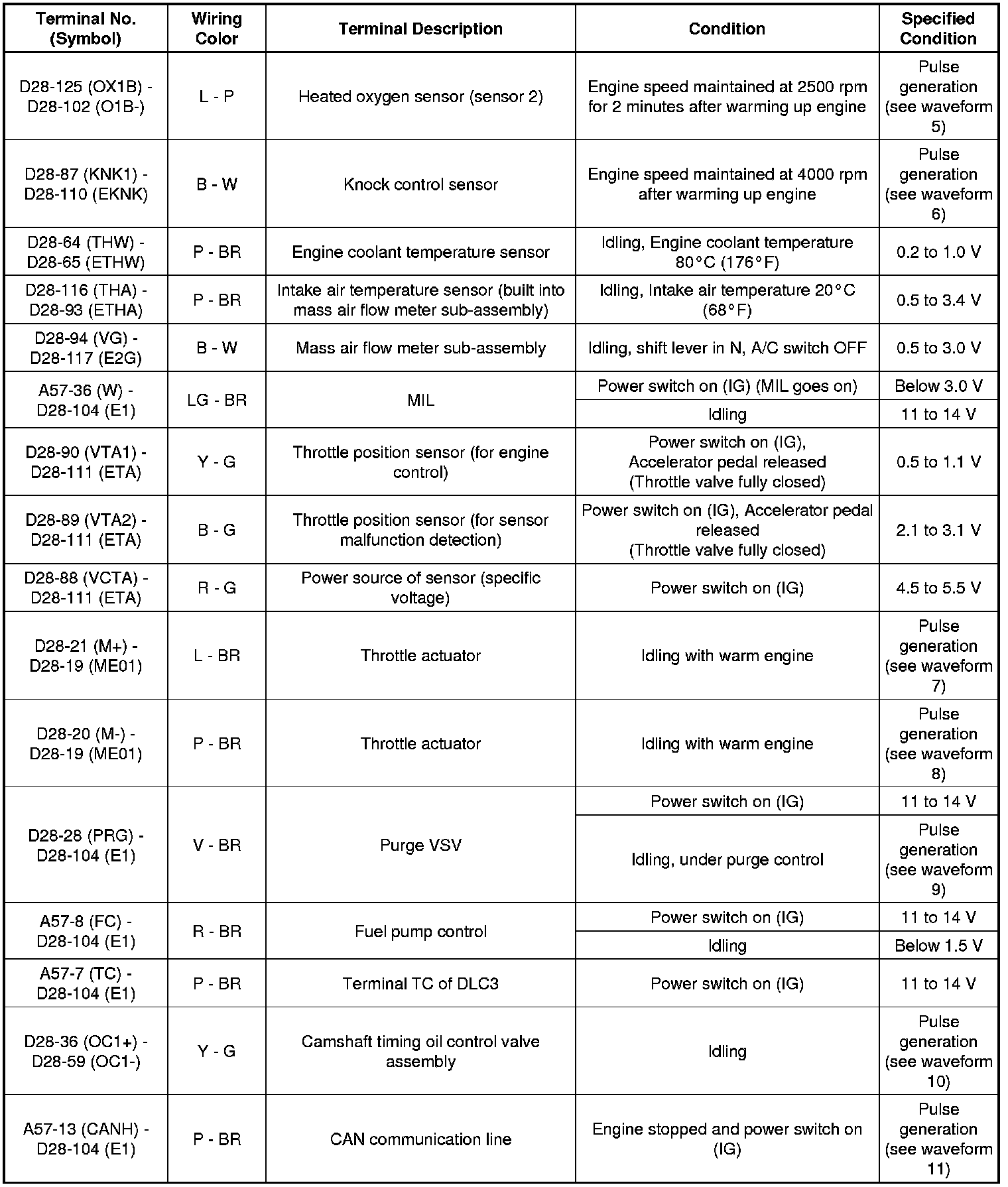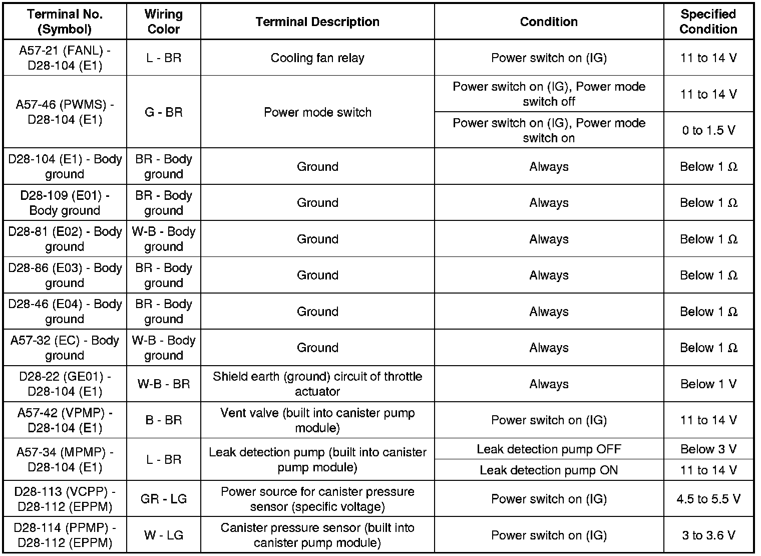 The standard normal voltage between each pair of the ECM terminals is shown in the table below. The appropriate conditions for checking each pair of the terminals are also indicated. The result of checks should be compared with the standard normal voltage for that pair of the terminals, and displayed in the "Specified Condition" column. The illustration above can be used as a reference to identify the ECM terminal locations.