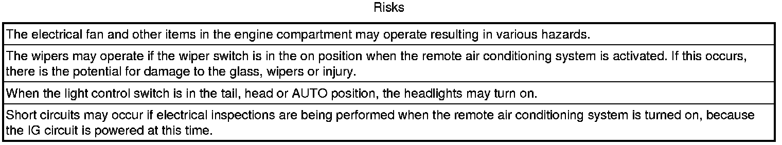 (a) Vehicles with the remote air conditioning system have the following risks that it is necessary to be aware of when performing repairs. Therefore, make sure to take care of the key (electrical transmitter) carefully so that the remote air conditioning system is not operated unexpectedly.