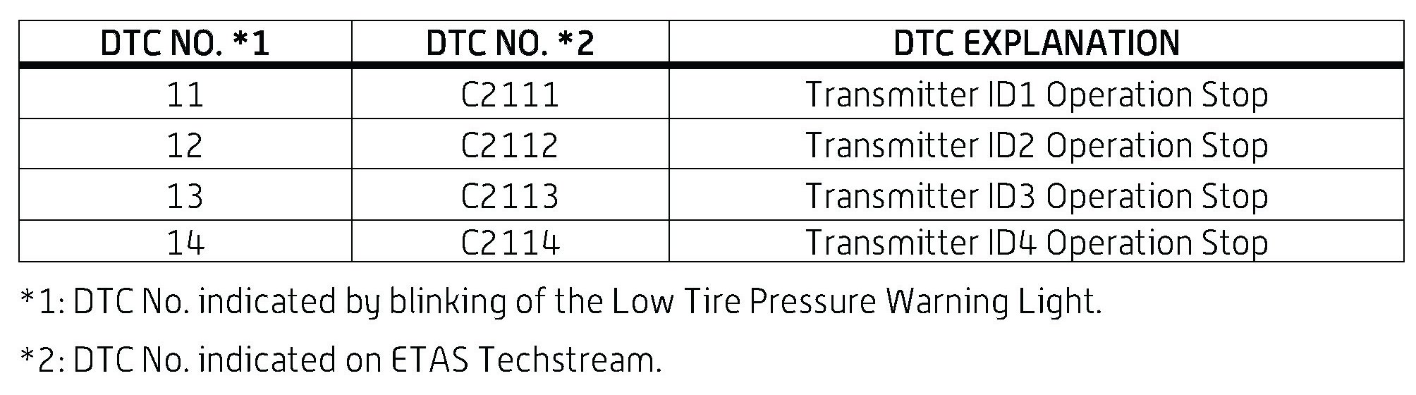 - The Diagnostic Trouble Codes (DTCs) listed may be stored in the TPWS ECU until the tire pressure warning valves/sensors are activated.