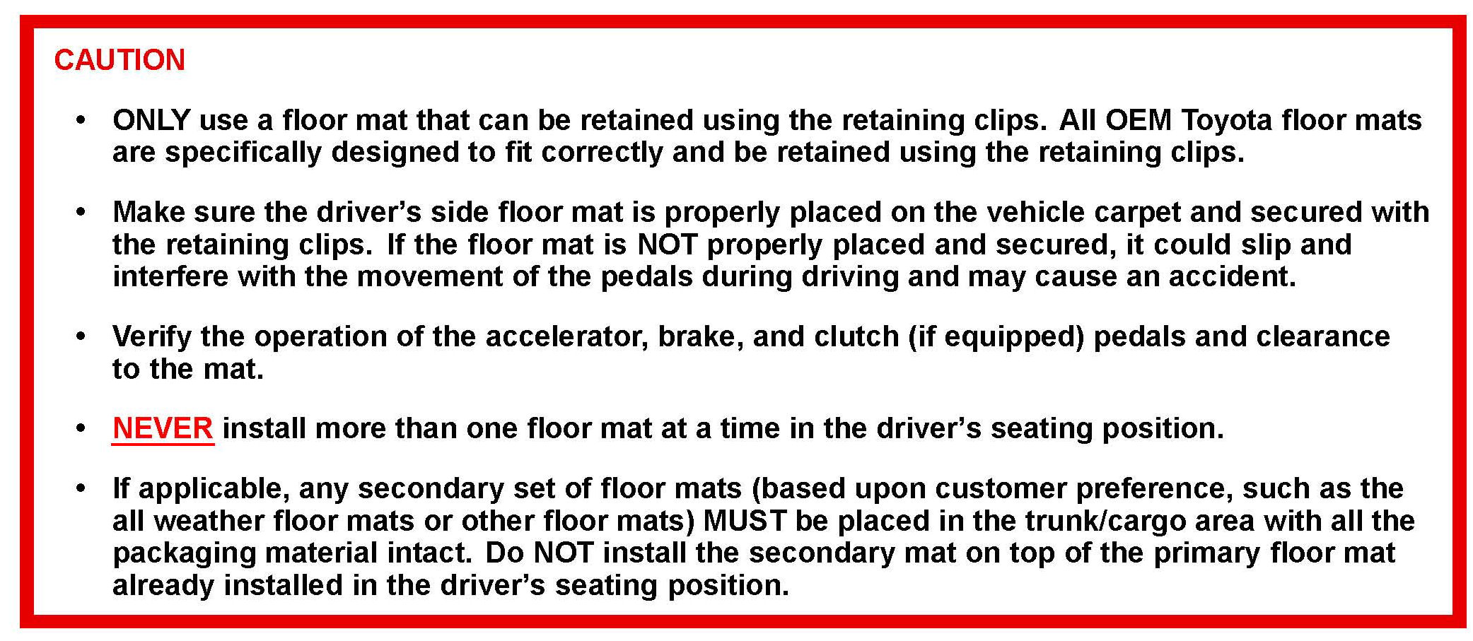 2010 model year Toyota vehicles are equipped with driver's side floor mat retaining clips to help ensure the floor mat stays in the correct position. In addition, some models may utilize retaining clips for passenger's side floor mats as well. Attach the driver's side and passenger's side (if applicable) floor mat to the vehicle carpet using the floor mat retaining clips during Pre-Delivery Service (PDS).