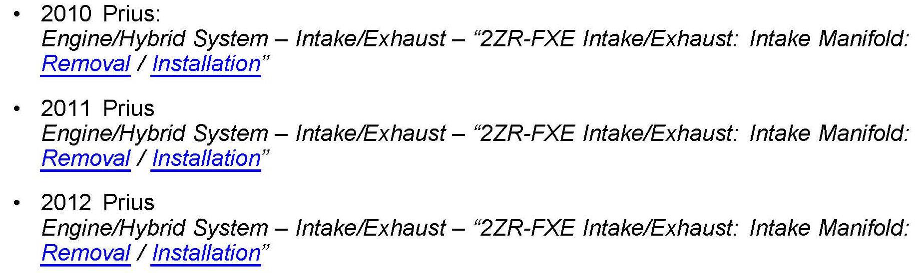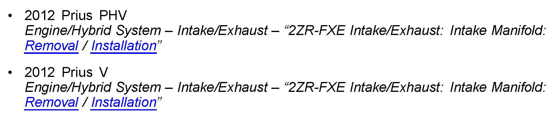 Some 2010-2012 vehicles equipped with a 2ZR-FXE engine may exhibit a MIL "ON" condition with Diagnostic Trouble Codes (DTCs) P2111 (Throttle Actuator Control System) and P0A0F (Engine Failed to Start) present when ambient temperatures are below 23°F/-5°C. The intake manifold assembly has been improved to help prevent this condition.