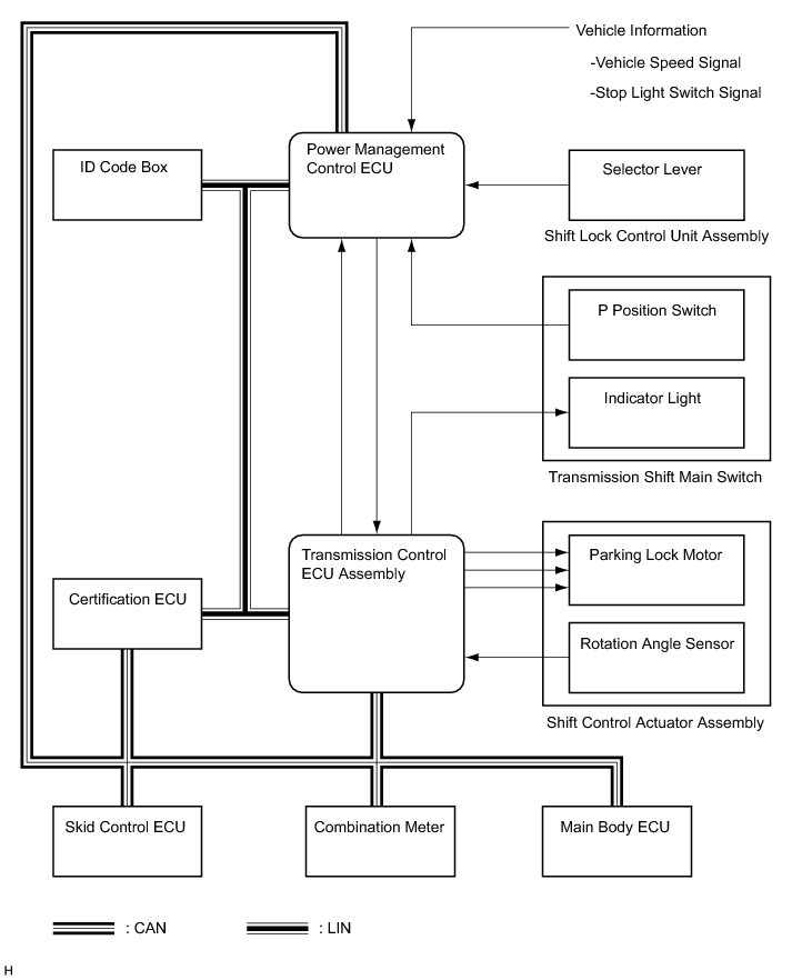 The transmission control ECU assembly locks/unlocks gearshift control based on lock/unlock request signals from the certification ECU (smart key ECU assembly).