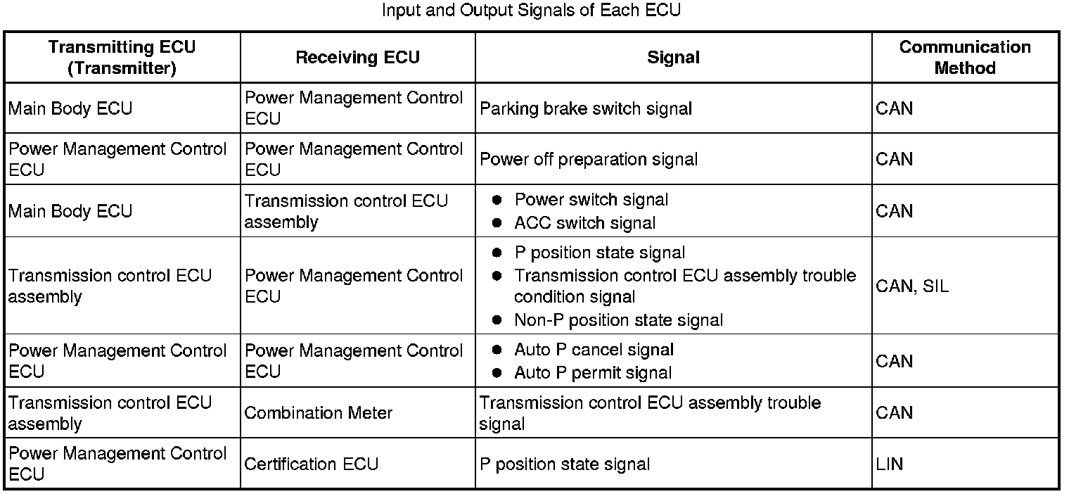 (2) This signal is then sent from the power management control ECU to the transmission control ECU assembly as a "P lock release" operation demand signal.