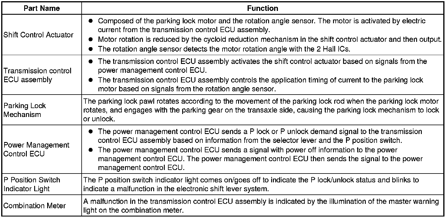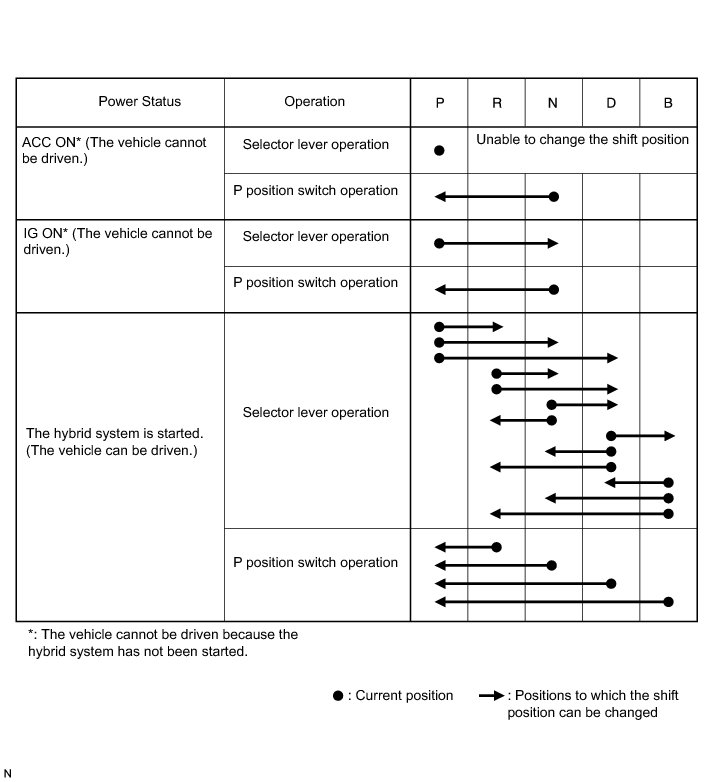 (a) The electronic shift lever system comprehensively determines vehicle conditions and changes the shift position, as shown in the following chart, by cooperating with the shift control function of the hybrid system (except when the reject function, described later, is in operation).