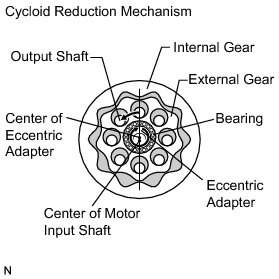 In the cycloid reduction mechanism, the output shaft is linked to the external gear. Together, they rotate only a single tooth when the eccentric adapter, which is linked to the motor, rotates once. Driving force is increased in this way so that the parking lock mechanism can be switched even when high output is required for parking on a hill, etc.