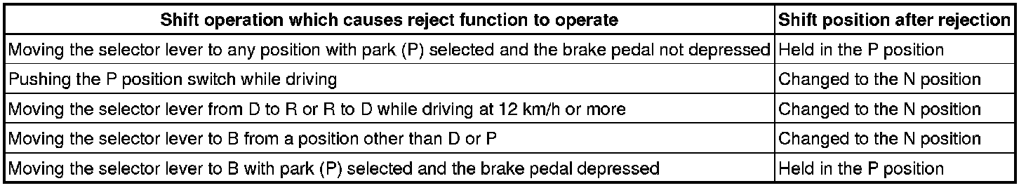 (a) In the electronic shift lever system, there may be a situation in which a shift change cannot be done for safety reasons. When attempting to move the selector lever in such a situation, the system sounds a reject buzzer inside the meter and changes the shift position as shown in the following table.