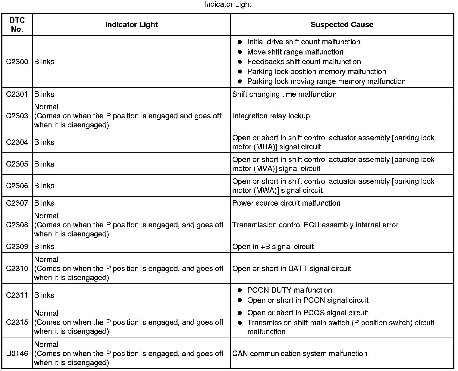 Even if the system has returned to normal, the indicator light does not return to normal without the selector lever moved from the home position to N. (Normal refers to the indicator light coming on when the P position is engaged and it goes off when the P position is disengaged.)