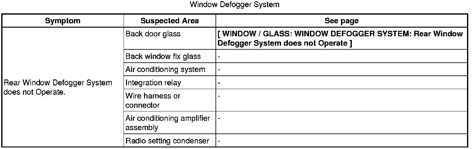 WINDOW / GLASS: WINDOW DEFOGGER SYSTEM: PROBLEM SYMPTOMS TABLE