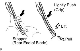 (a) Lift and pull the end of the wiper rubber protrusion from the blade stopper as shown in the illustration.