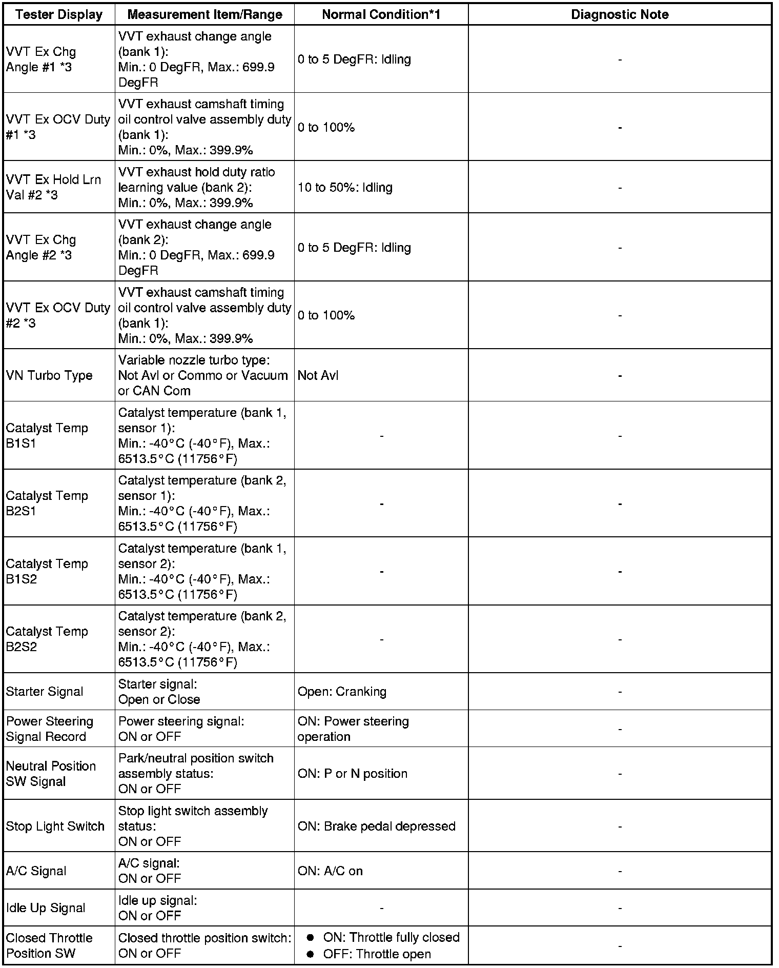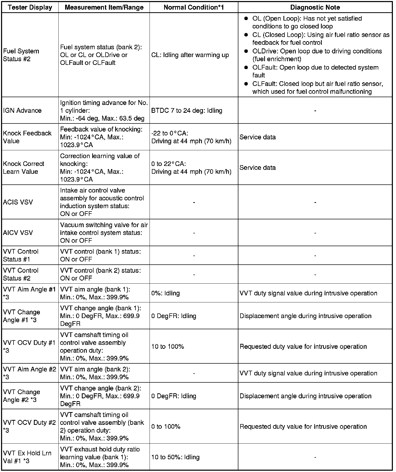 * *3: Data List values are only displayed when performing the following Active Test: Control the VVT System (Bank 1, 2), Control the VVT Linear (Bank 1, 2) and Control the VVT Exhaust Linear (Bank 1, 2). For other Active Test, the Data List value will be 0.