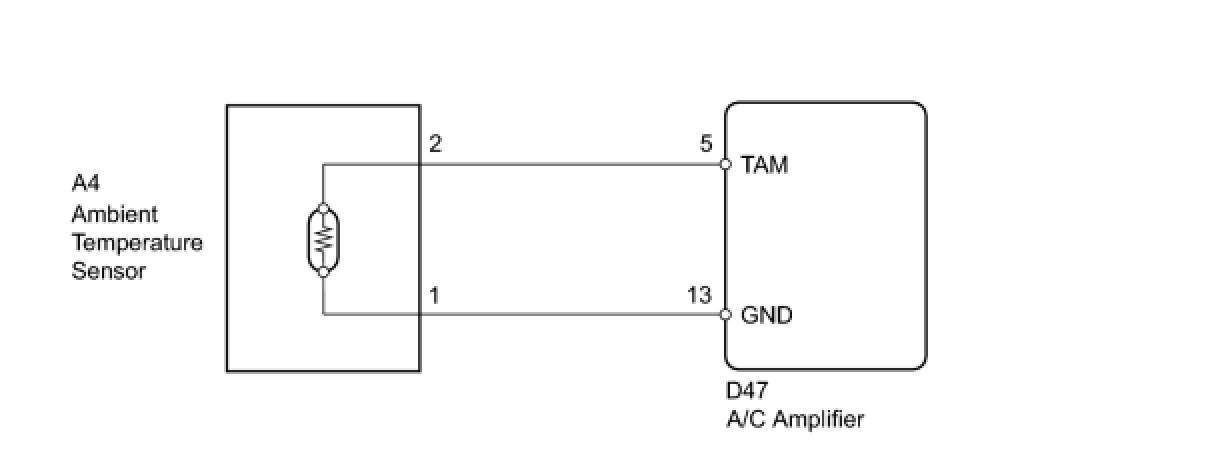 The A/C amplifier applies voltage (5 V) to the ambient temperature sensor and reads voltage changes as the resistance of the ambient temperature sensor changes.