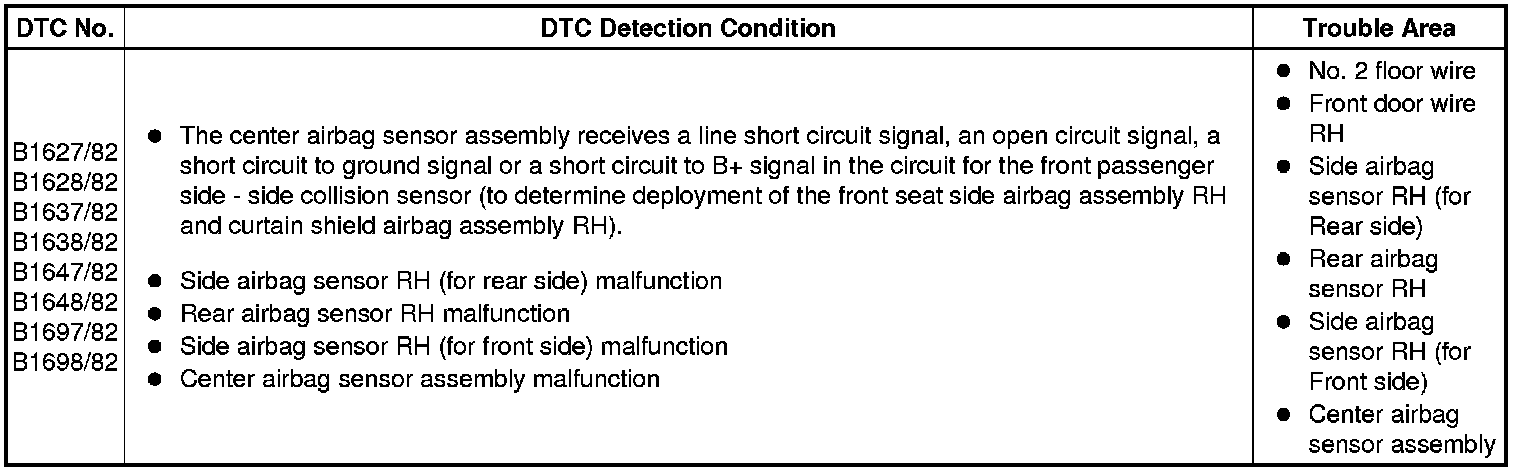 These DTCs are recorded when a malfunction is detected in the circuit for the front passenger side - side collision sensor (to determine deployment of the front seat side airbag assembly RH and curtain shield airbag assembly RH).